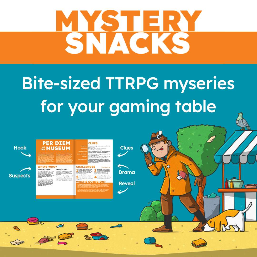 Mystery Snacks, a family-focused TTRPG sourcebook, is available for pre-order! Get "Dude, Where’s My Broom” and seven other easy-to-run adventures for kids at mystery-snacks.backerkit.com. A huge thanks to our friend Steph C. of TTRPGkids.com for letting us use their adventure to inspire this story!